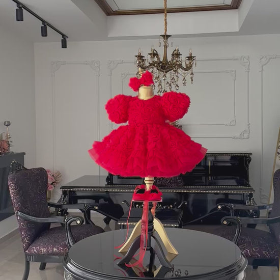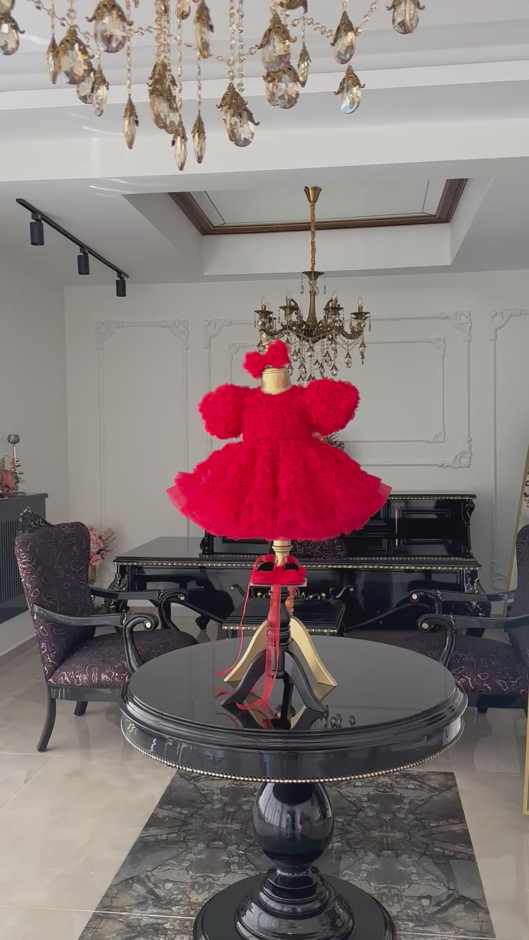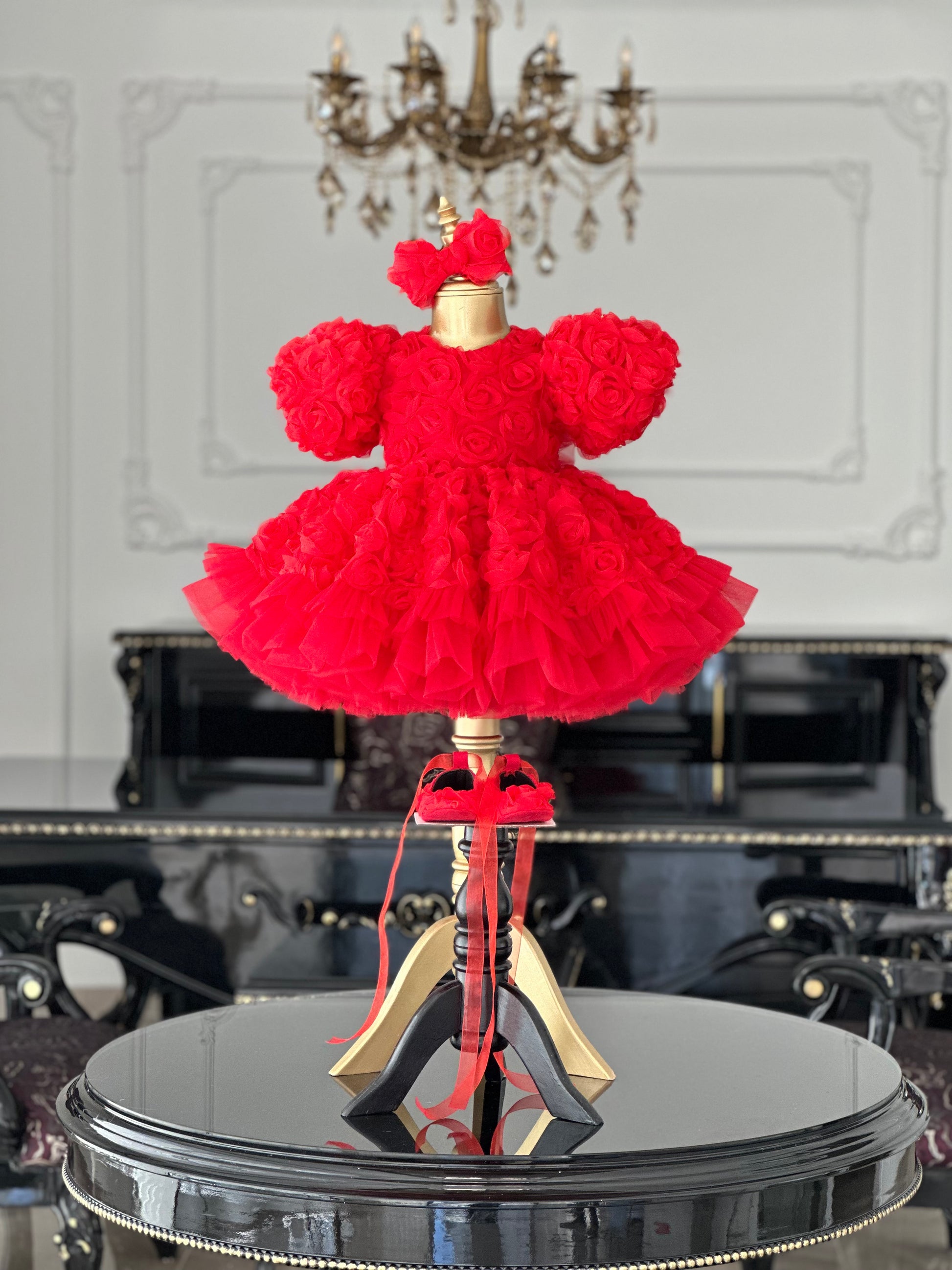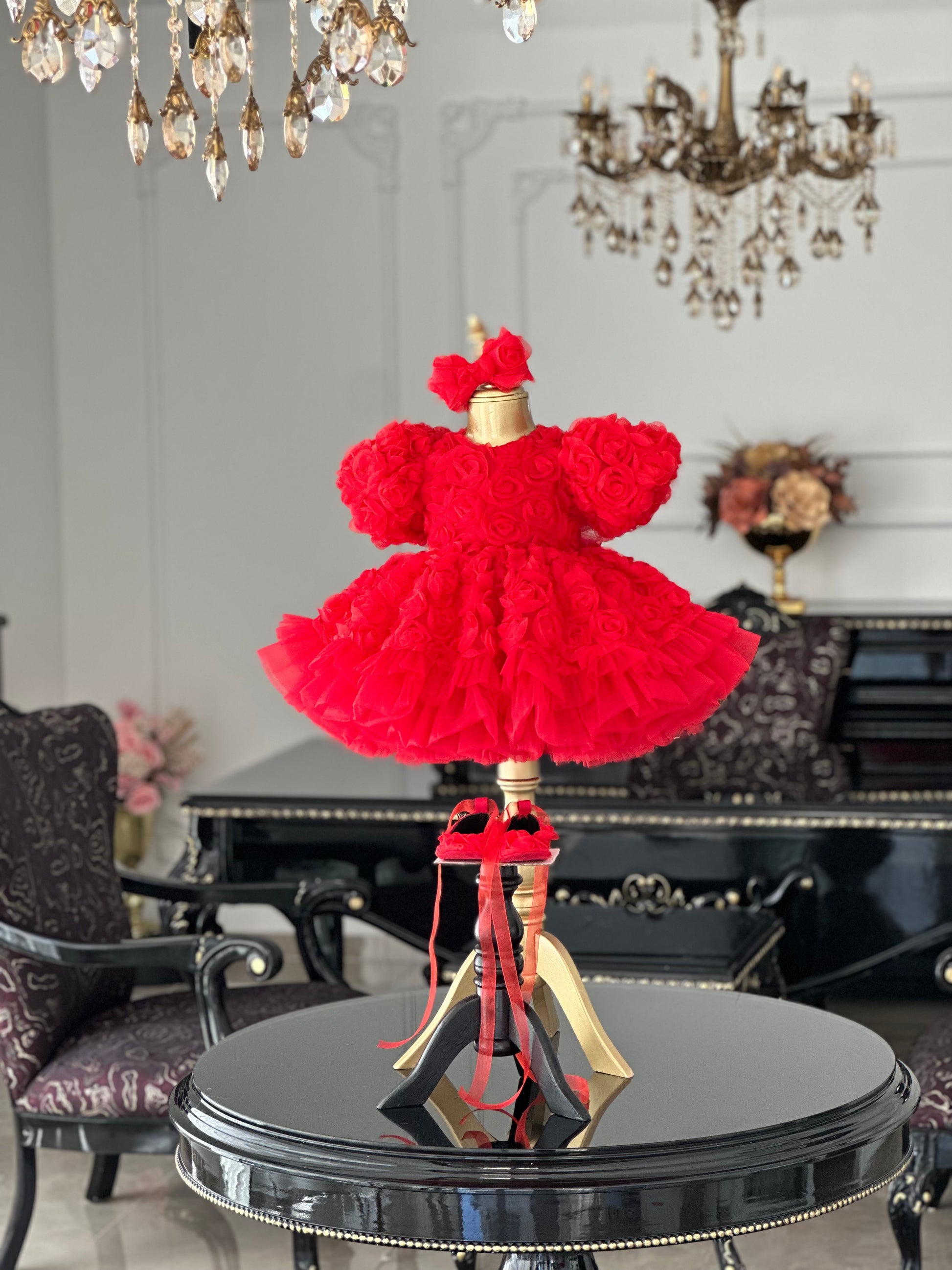 Rose Fırfırlı Kırmızı Abiye Elbise - Özel Tasarım Kız Çocuk Abiye