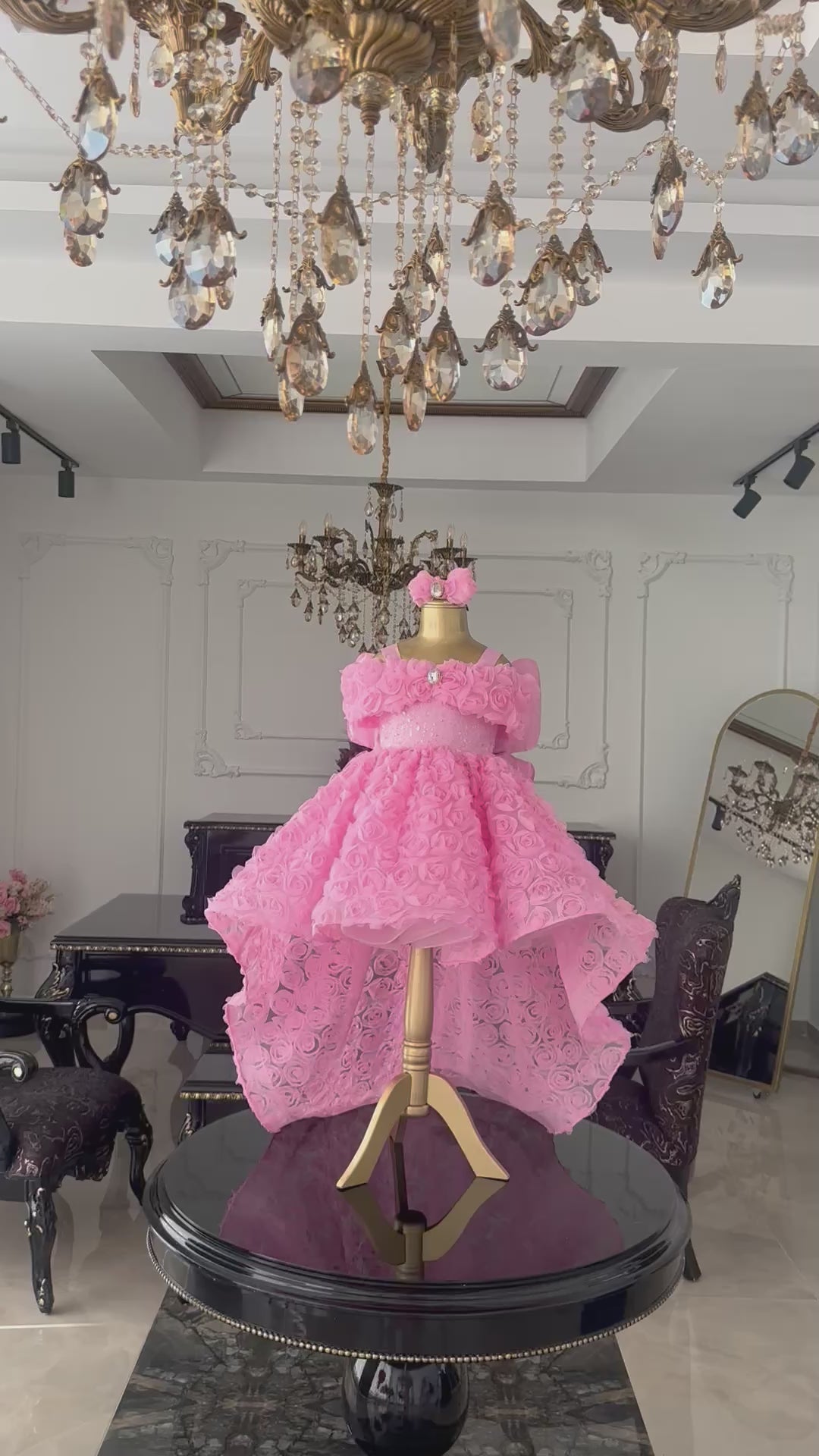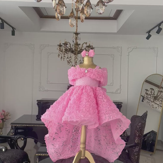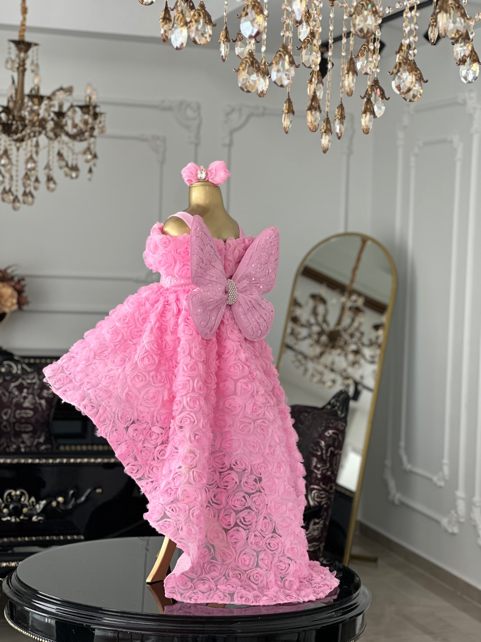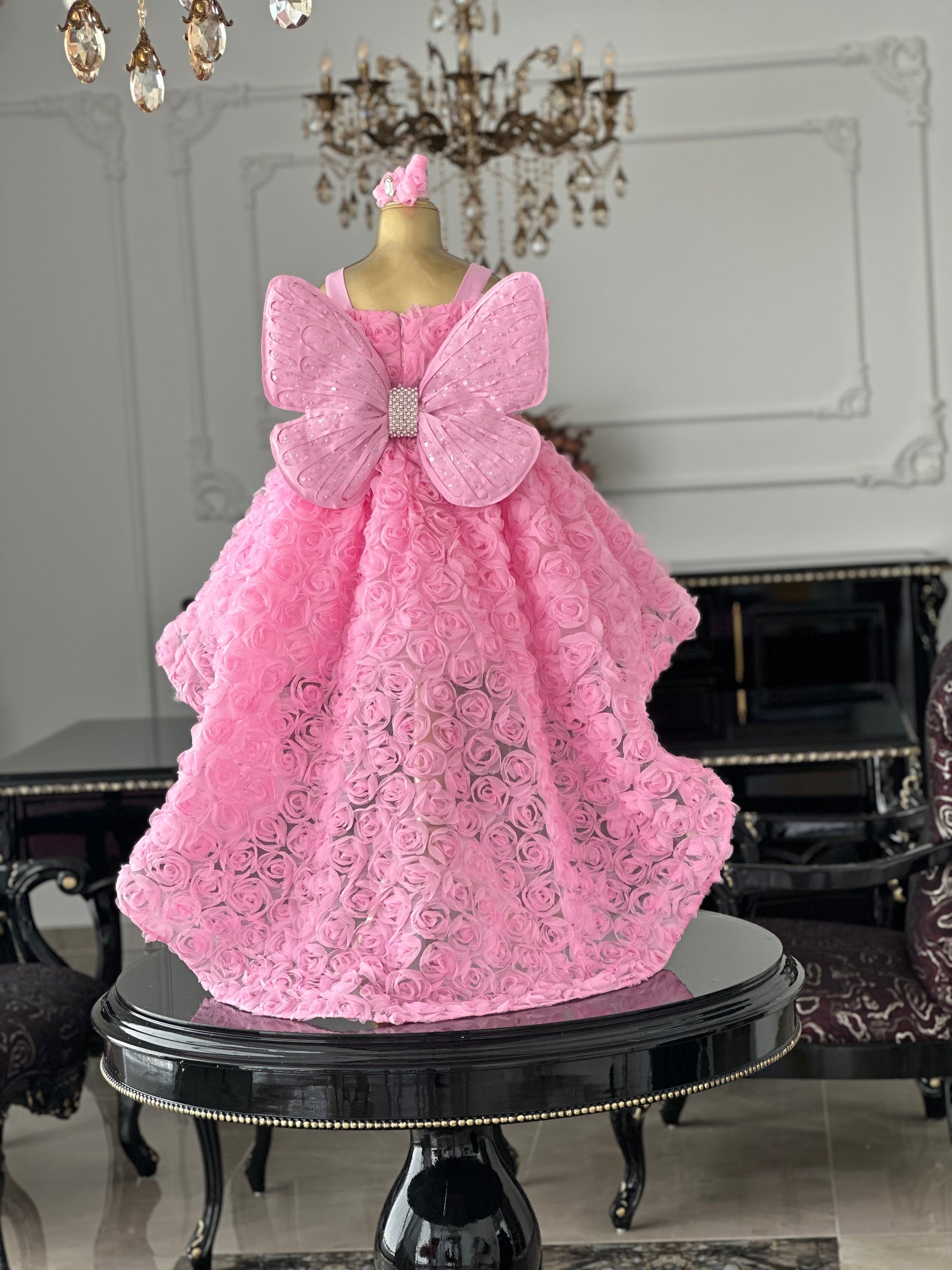 Rose Kuyruklu Şeker Pembe Elizabeth Kelebek Elbise - Özel Tasarım Kız Çocuk Abiye