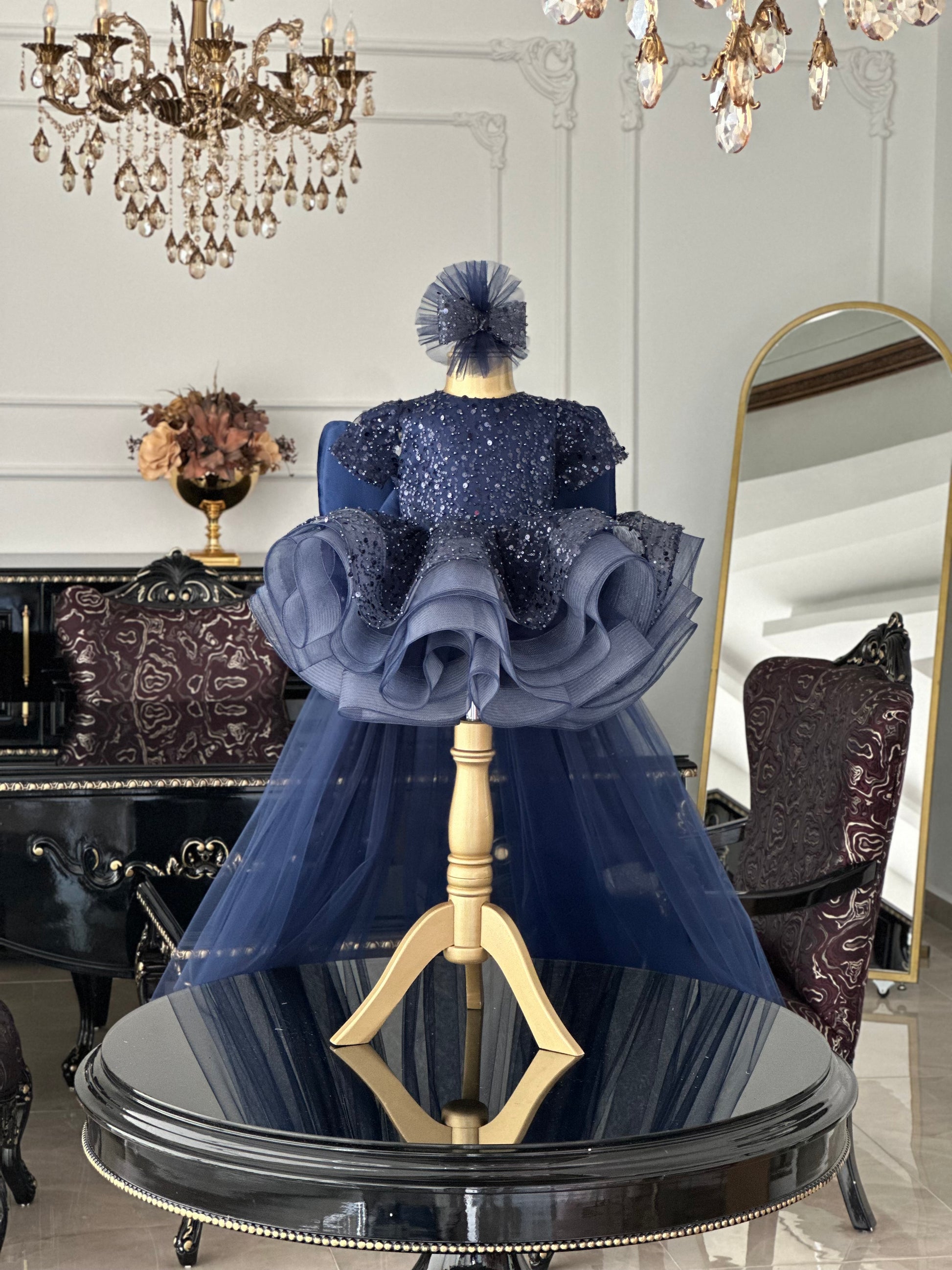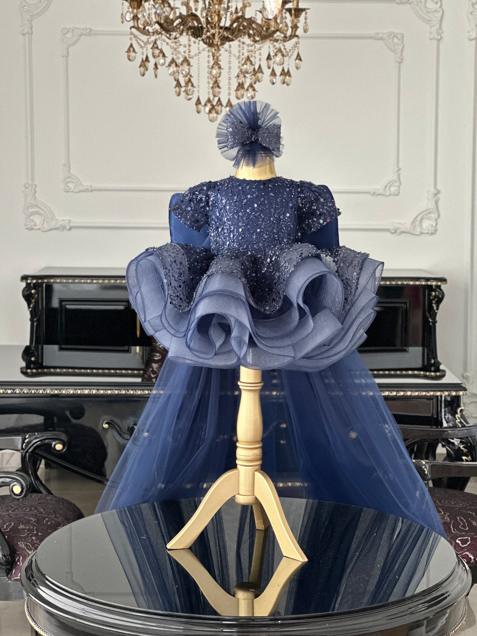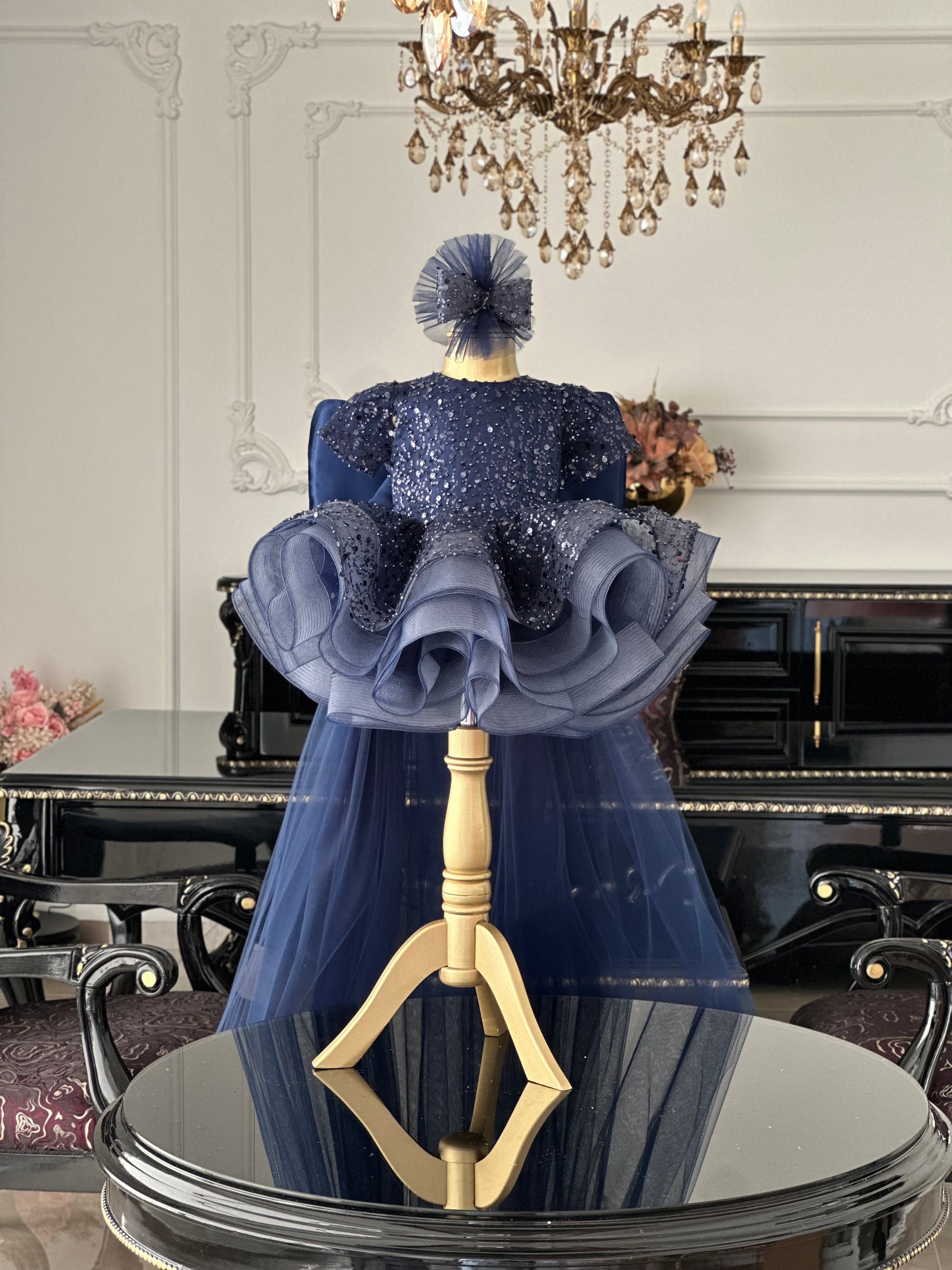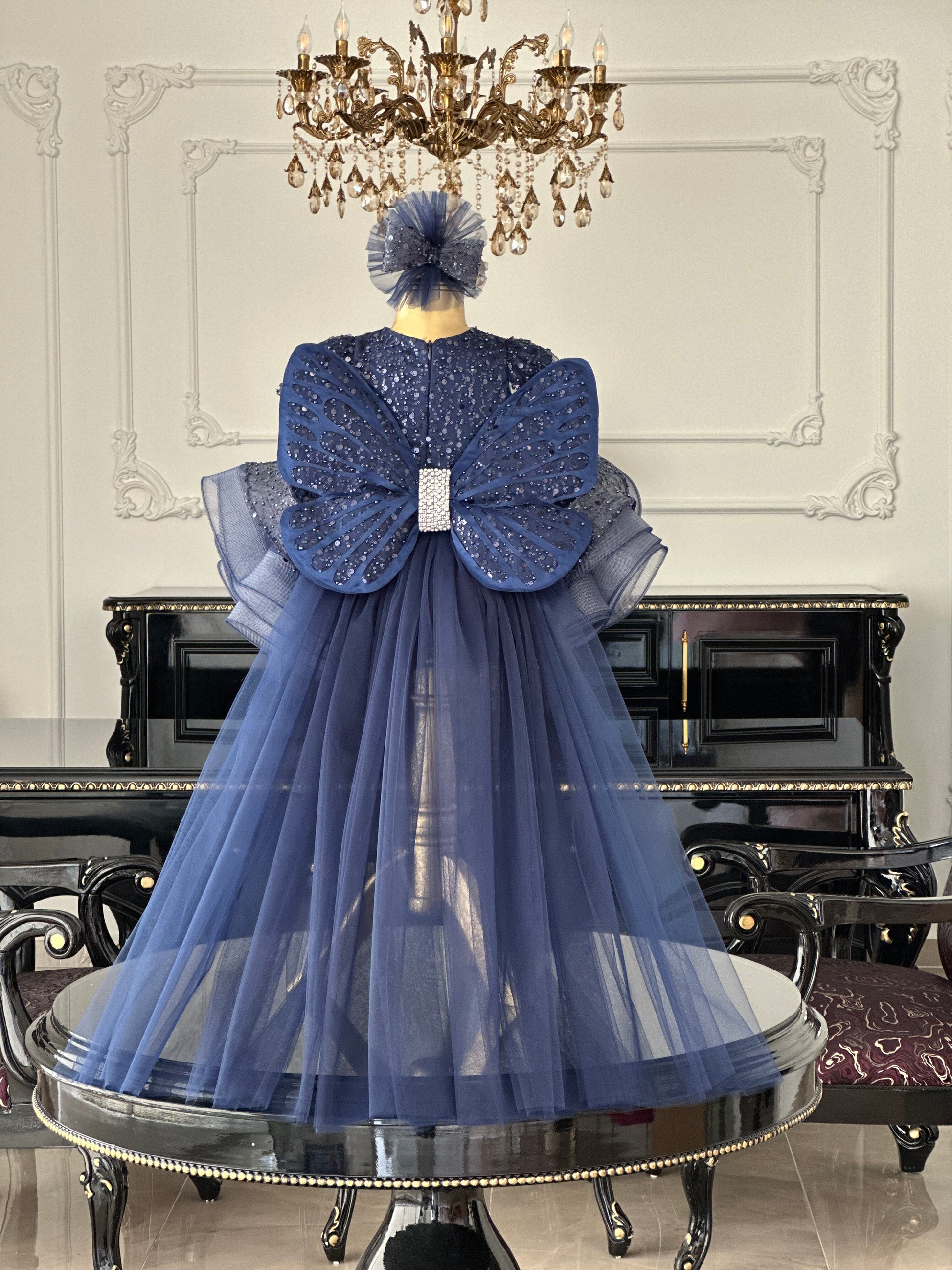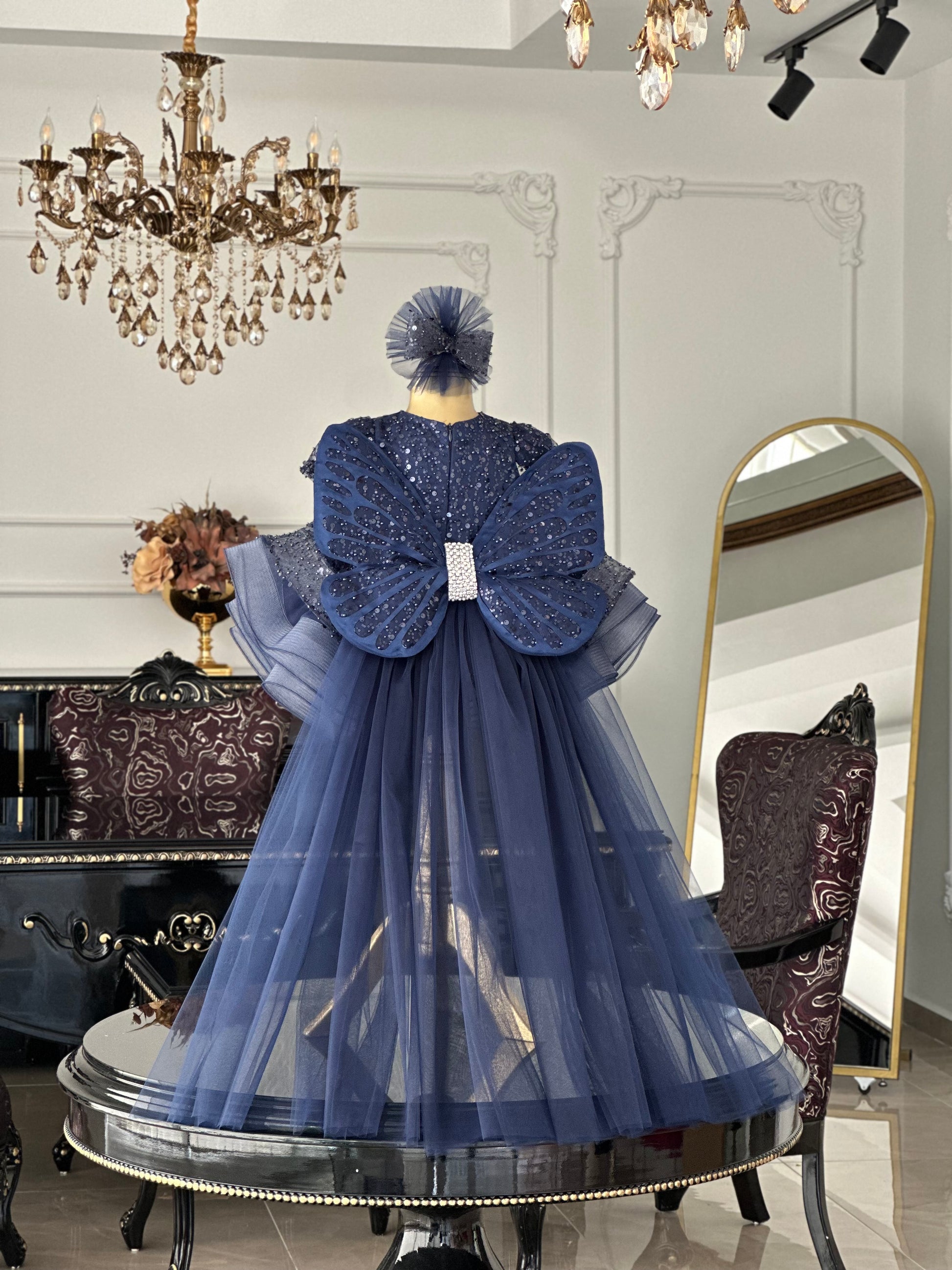 Shiny Lacivert Tül Kuyruklu Kelebek Elbise - Özel Tasarım Kız Çocuk Abiye