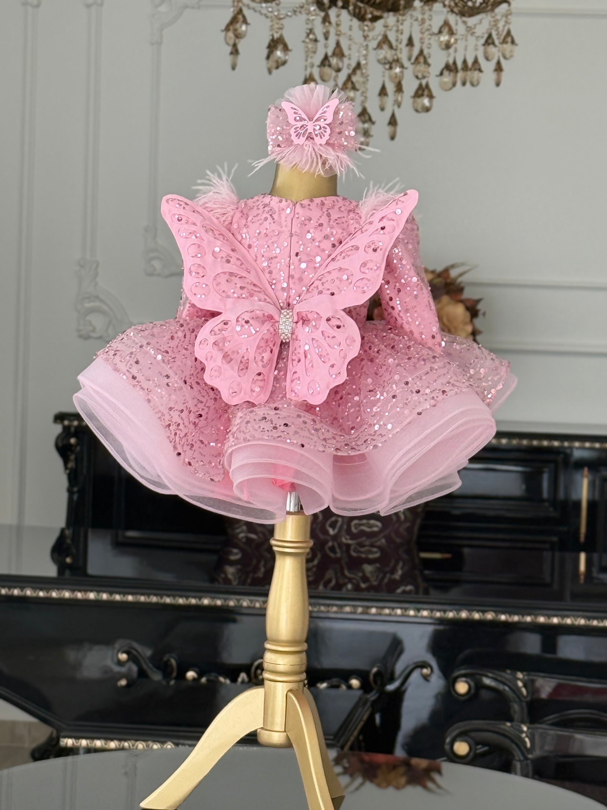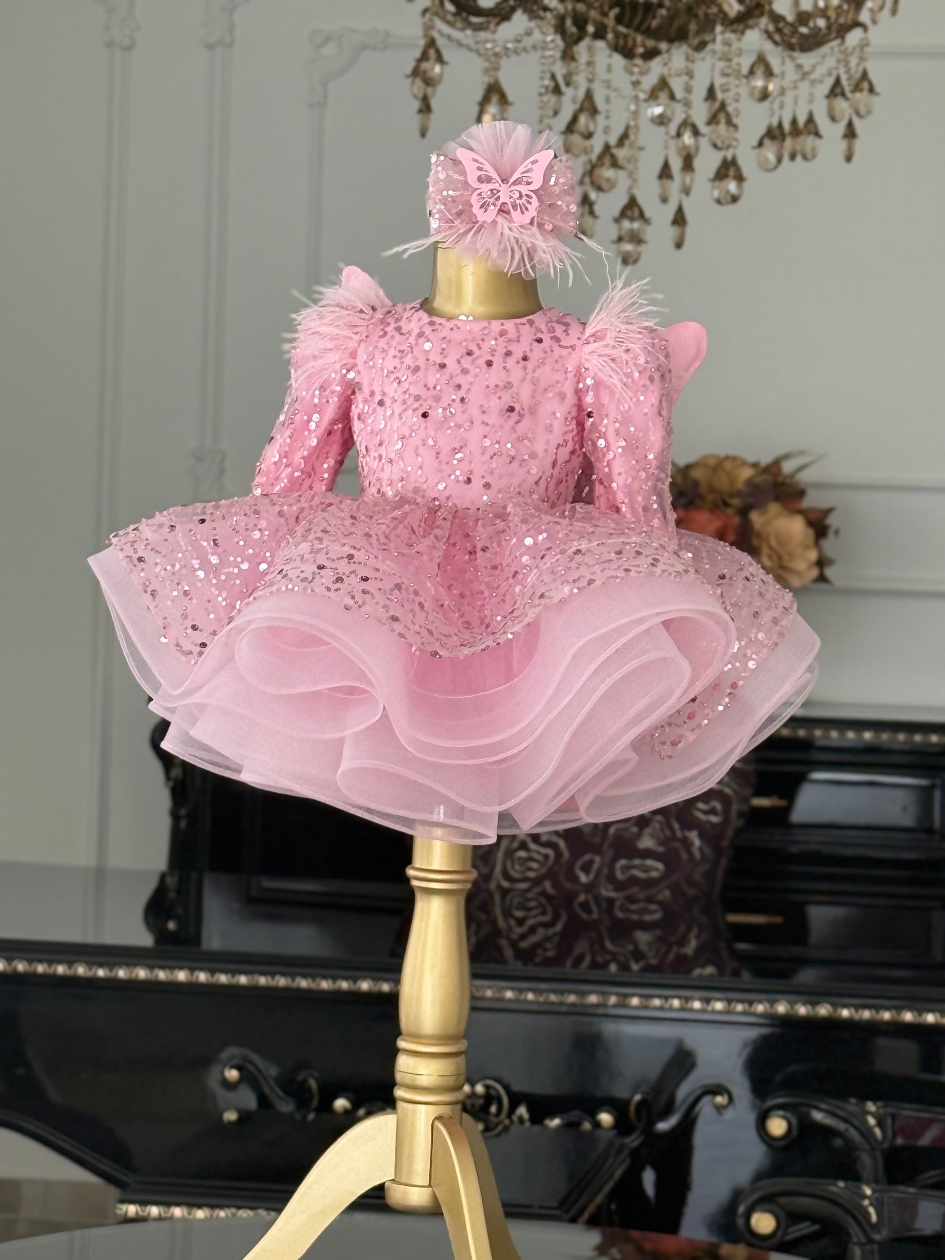 Özel günlerin vazgeçilmezi olan bu asil pembe elbise, kız çocuklarınızı adeta prenses gibi hissettirecek! Üstün kaliteli organze kumaşıyla tasarlanan elbise, hacimli etek detayıyla zarafeti ön plana çıkarıyor. Kabarık omuzlar, uzun tül kuyruk ve arka kısmındaki sevimli kanat detayı ile prenseslere layık bir görünüm sunuyor.